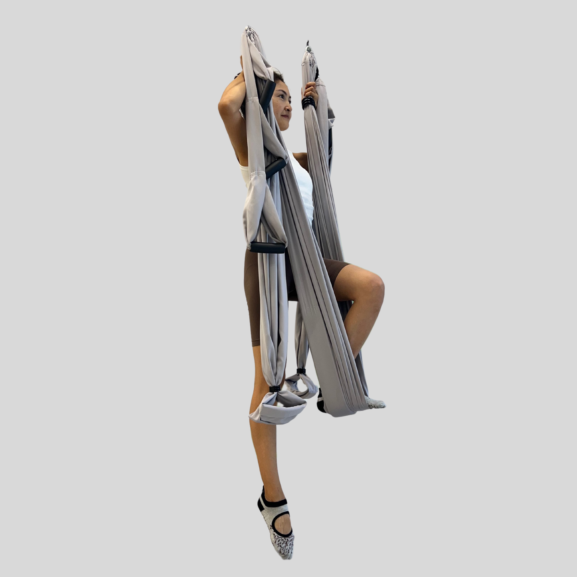 Исходное положение: стоя, гамак перед нами. Собираем полотно в узкую ленту и наступаем левой ногой. Правую ногу пока устанавливаем у основания левого бедра. Выводим только правую руку вперед, упираясь плечом в стенку гамака. Не наваливаемся на гамак. Взгляд фиксируем на неподвижной точке впереди. Тянемся за макушкой к потолку, направляя при этом плечи и лопатки вниз, а лобковую кость — на себя. Коленная чашечка опорной ноги подтянута.