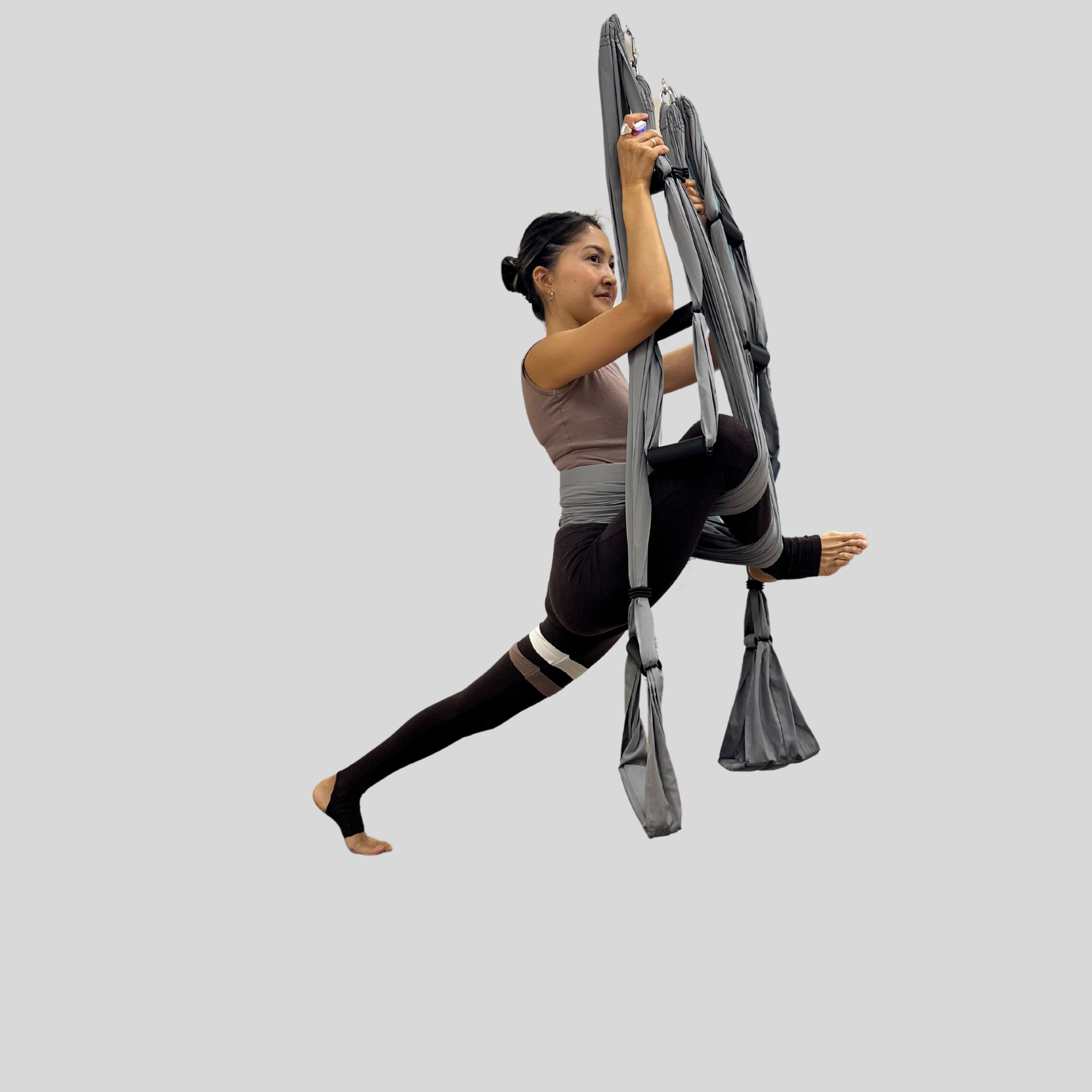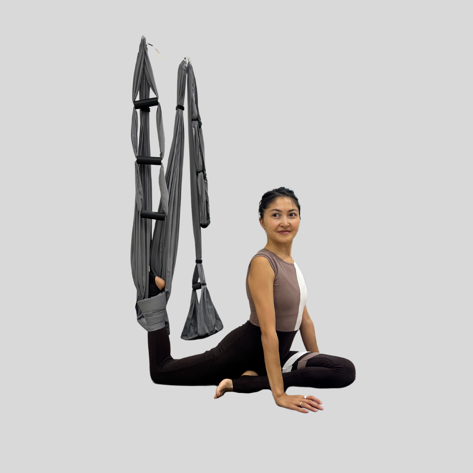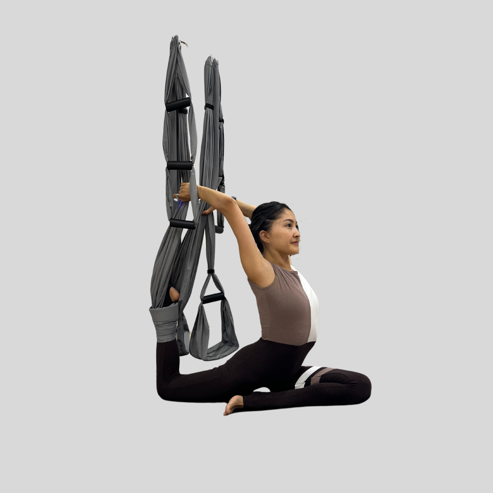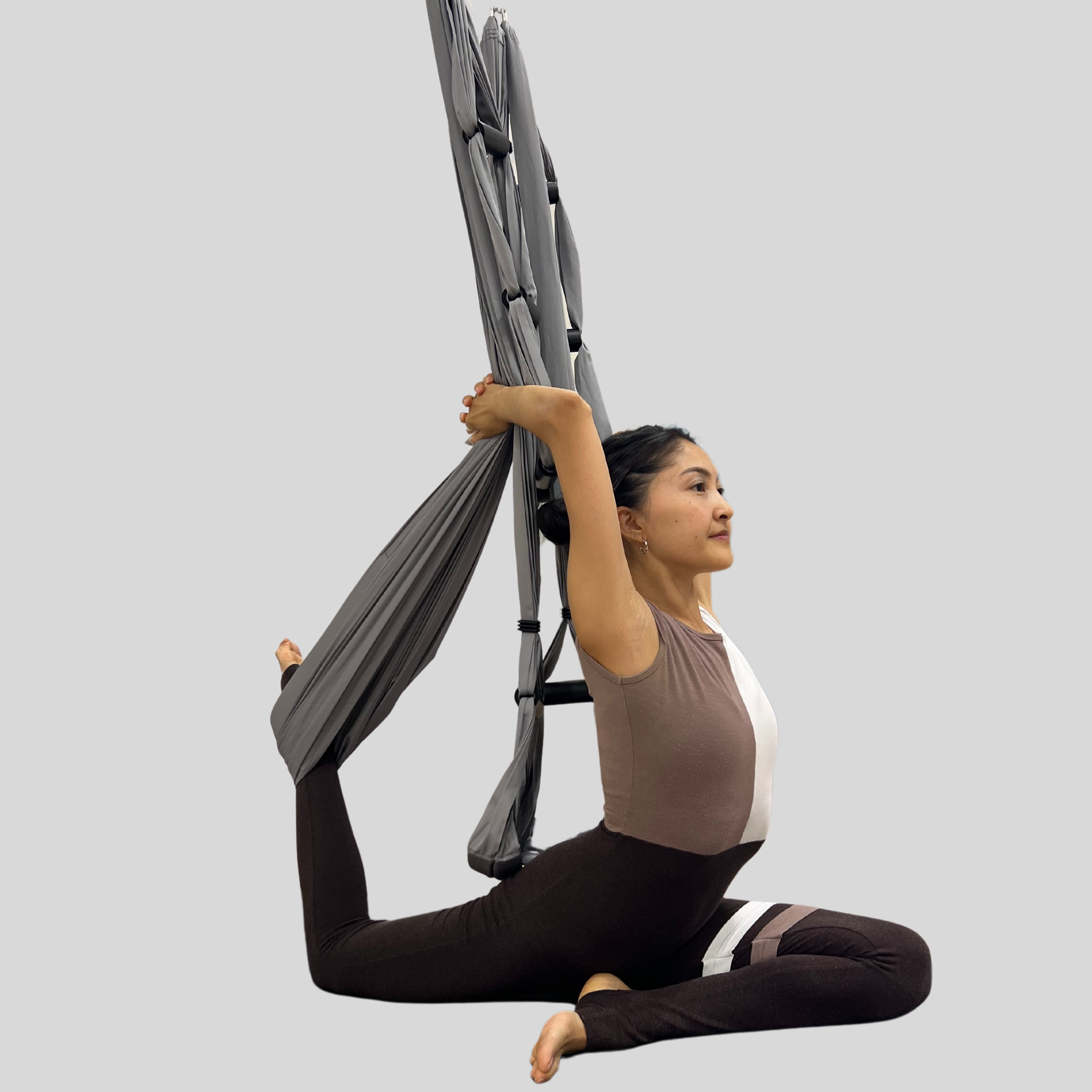 Исходное положение: Из положения планка, полотно обмотано вокруг левой голени. Проносим правое колено вперёд между ладоней.Опускаем таз — правая пятка упирается в левую подвздошную кость. Левая нога лежит на полу: бедро, колено и подъём направлены вниз, пятка — к потолку.Ладони располагаем рядом с тазом, выравниваем положение корпуса. Остаёмся здесь или опускаемся в наклон.