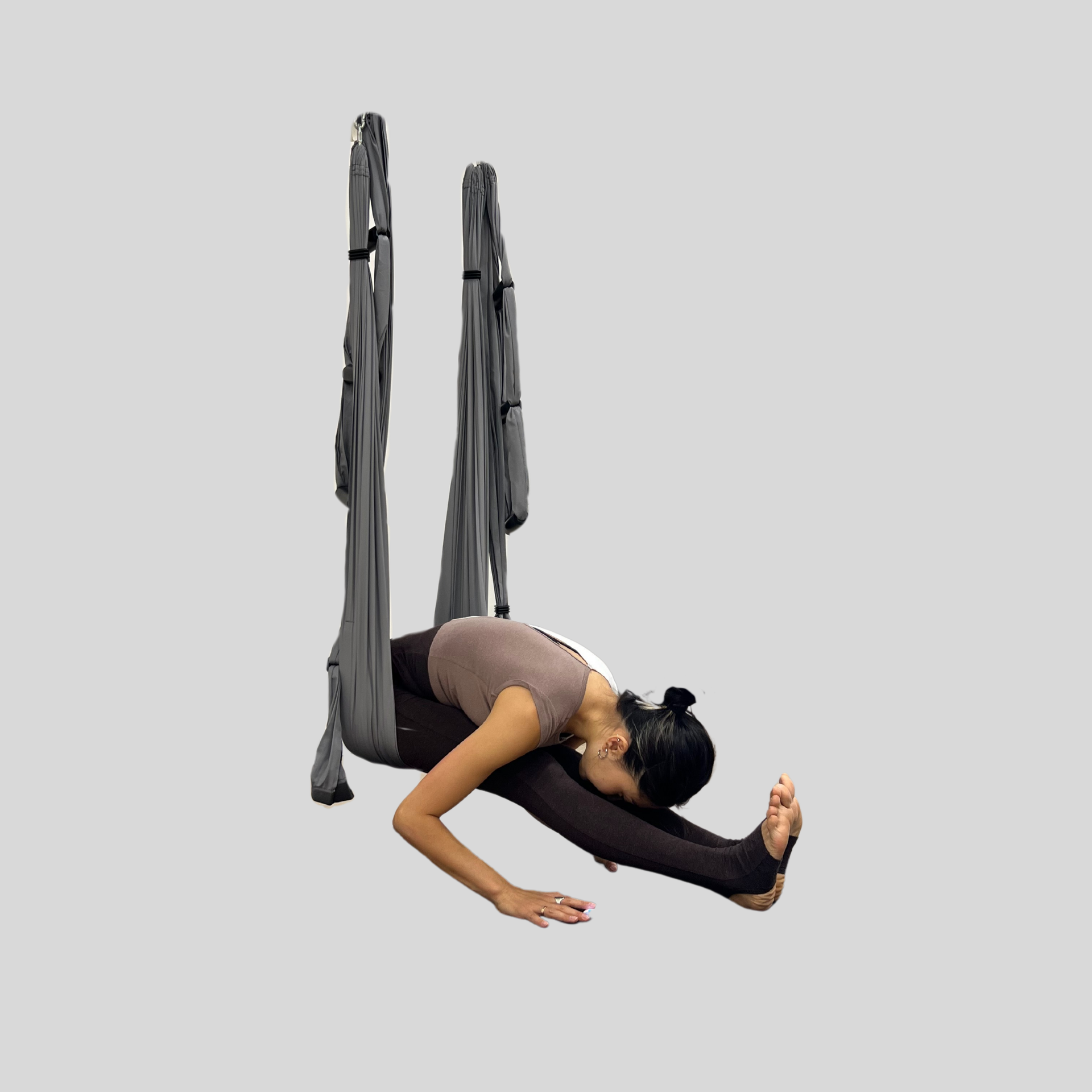 Исходное положение: поза Дандасана сидя в гамаке. Со вдохом отталкиваясь тазом от гамака, вытягиваемся за макушкой вверх. Немного сгибаем ноги в коленях, таз наклоняем вперед, живот укладываем на бёдра, руками захватываем стопы. Постепенно выпрямляем ноги в коленях, сохраняя живот на бёдрах, удлиняемся по всей задней линии тела — от пяток до макушки.