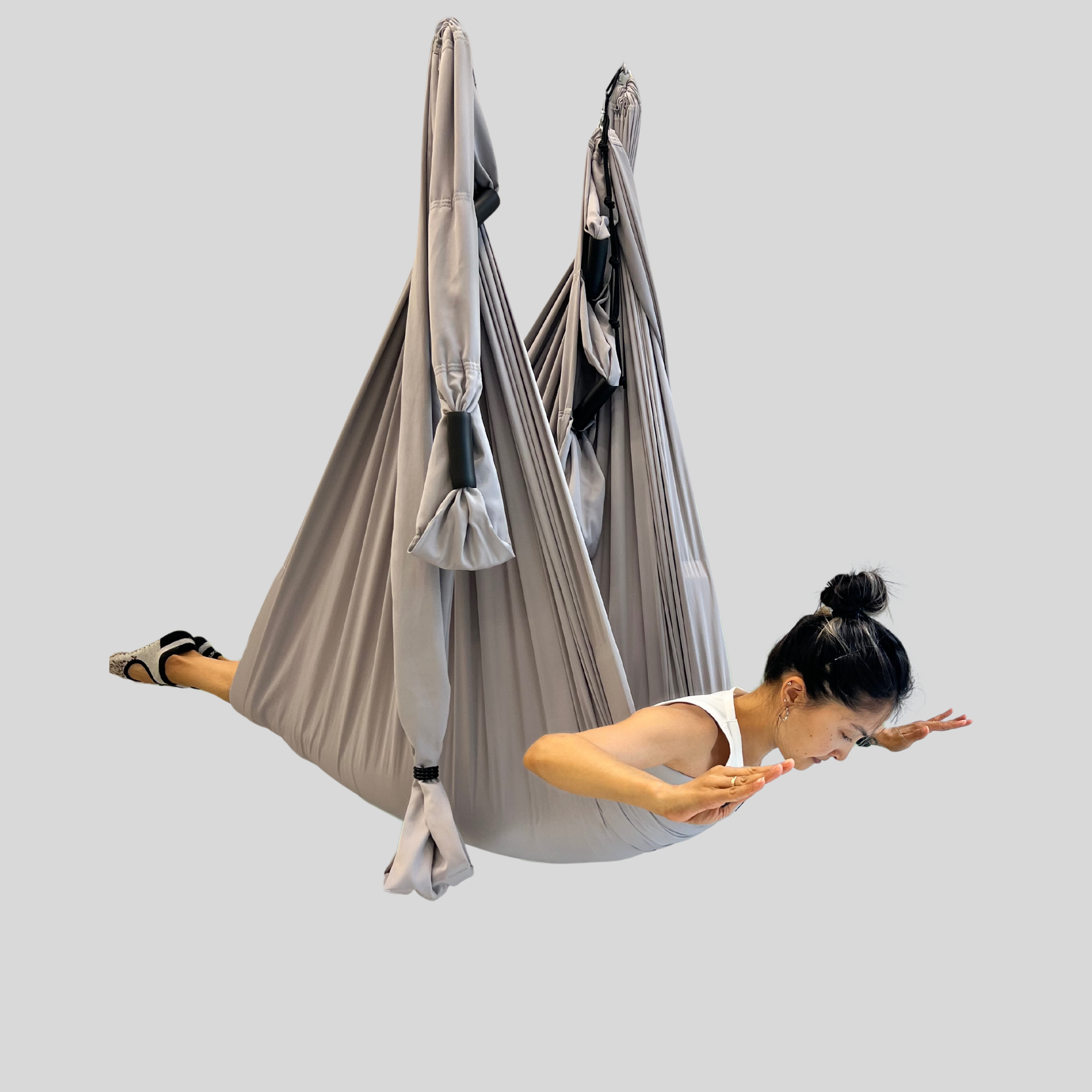 Исходное положение: лёжа в широком гамаке. Гамак раскрыт от грудины до голени. На вдохе поднимаем руки, корпус и ноги вверх. Вытягиваемся за руками вперёд и вверх, за ногами — назад и вверх. Лобковая и подвздошные кости прижимаем к ткани полотна. Остаёмся в позе на несколько глубоких циклов дыхания.