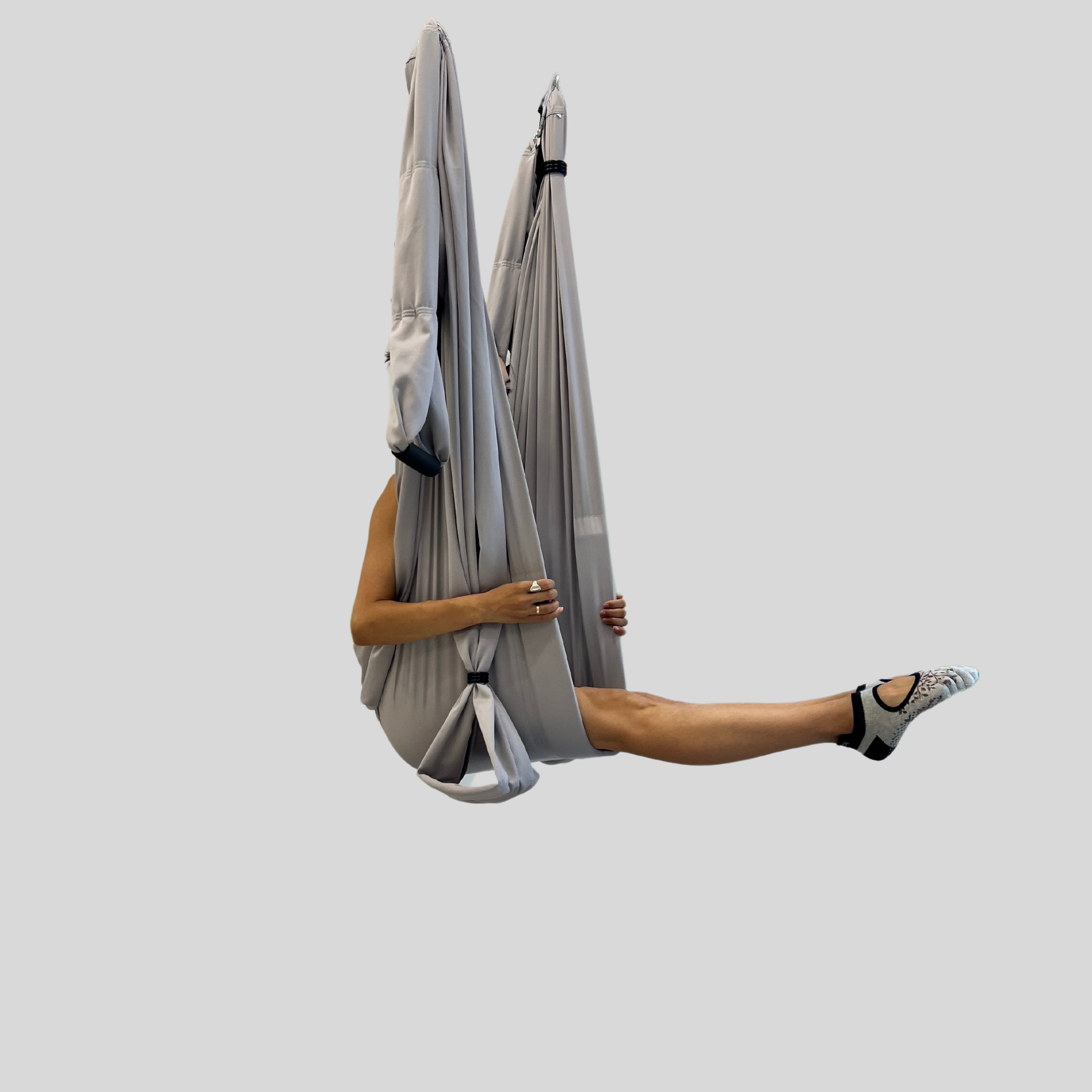 Исходное положение: сидя в гамаке, ноги в ручках. Захватываем ручки и отталкиваясь тазом от полотна вытягиваемся за макушкой. Немного сгибаем ноги в коленях, таз наклоняем вперед, живот укладываем на бёдра.Постепенно выпрямляем ноги в коленях, сохраняя живот на бёдрах, удлиняемся по всей задней линии тела — от пяток до макушки. Оставляем хват за ленты или перехватываем за стопы.