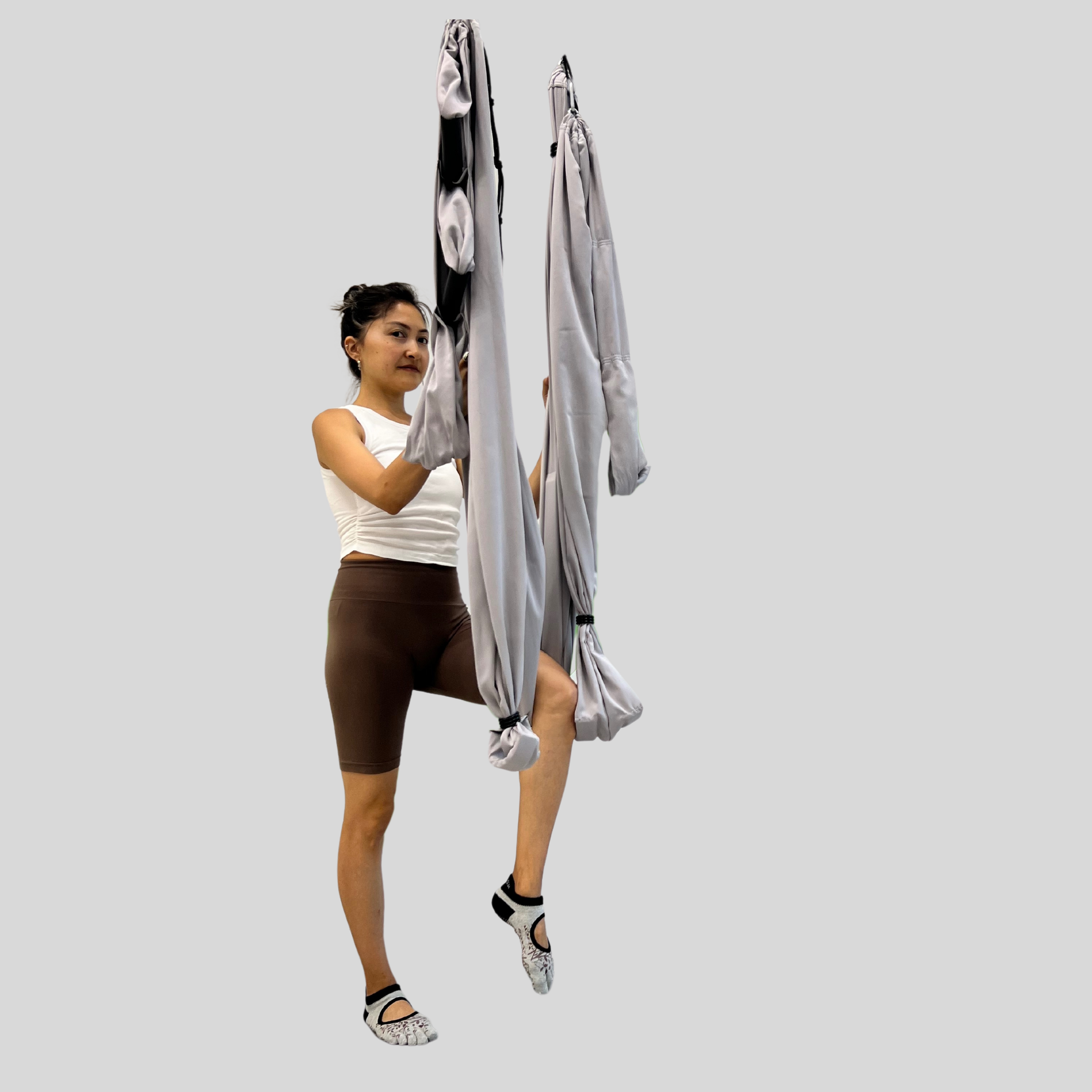 Исходное положение стоя, правая нога в гамаке. Удобно захватив гамак постепенно направляем таз вперед. Стягиваем бёдра к центру, не допуская раскрытия таза. Чтобы выйти из асаны, переносим вес назад оттягивая таз и медленно возвращаемся в исходное положение. Повторяем на другую ногу.