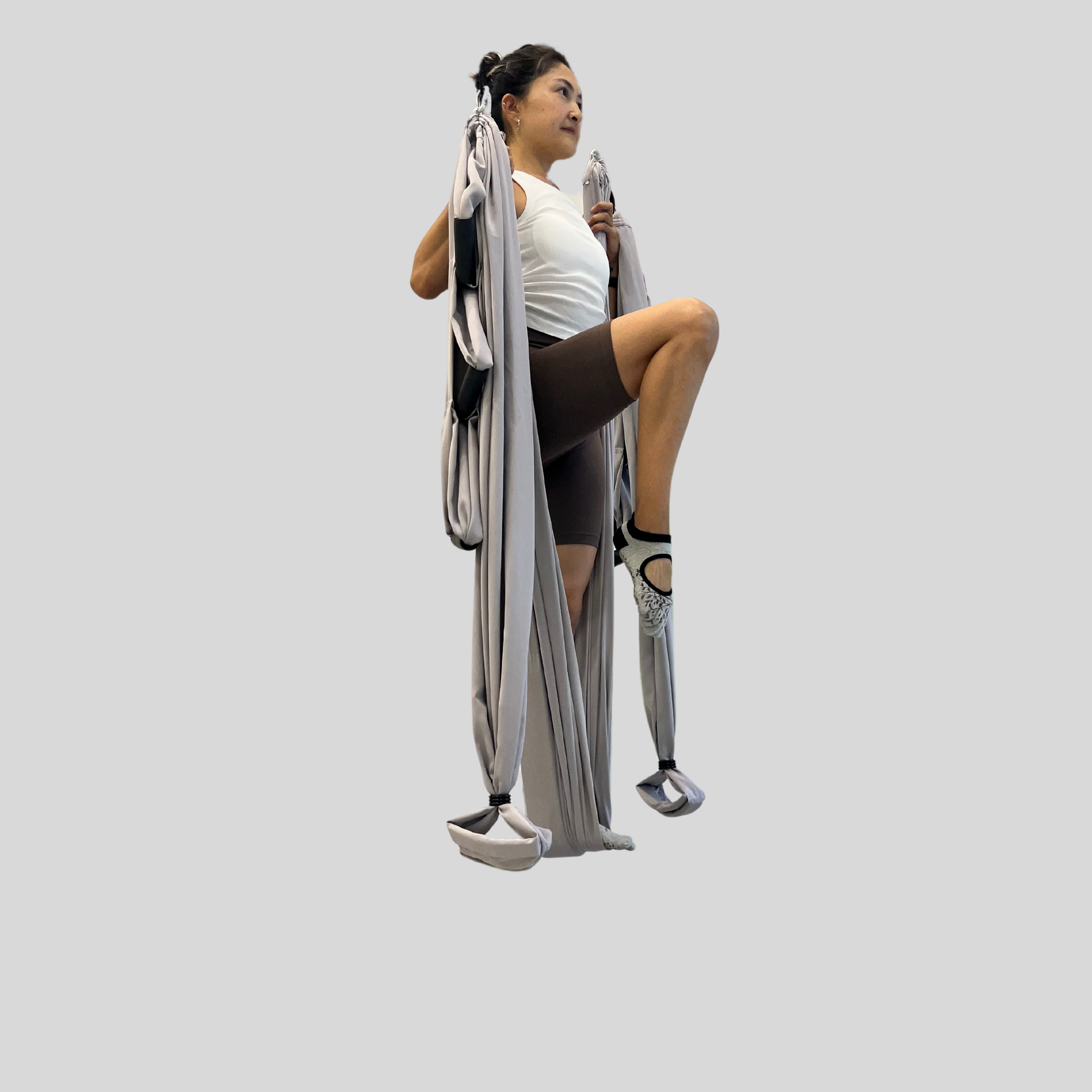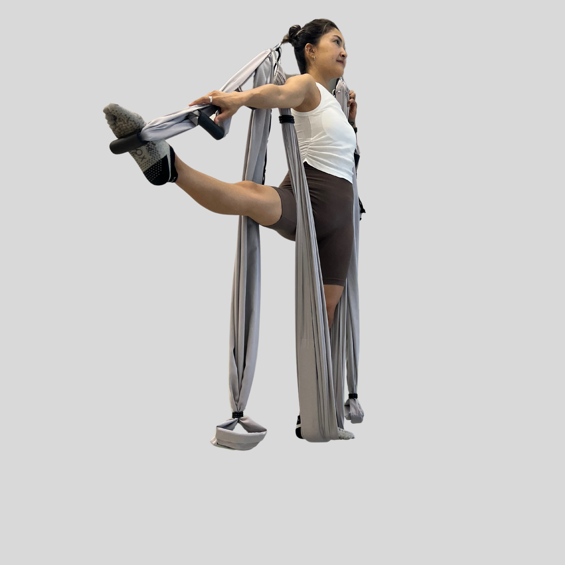Исходное положение: поза «дерева». Сгибаем правую ногу в колене и подтягиваем бедро к животу. Захватываем тремя пальцами правой руки большой палец правой стопы. Если такой хват не доступен, перехватите за стопу или вденьте ногу в ручку. Выпрямляем правую ногу в сторону и вверх. Левой рукой держимся за гамак, чтоб корпус не навалился на одну сторону. Остаёмся в этом положении несколько циклов дыхания.