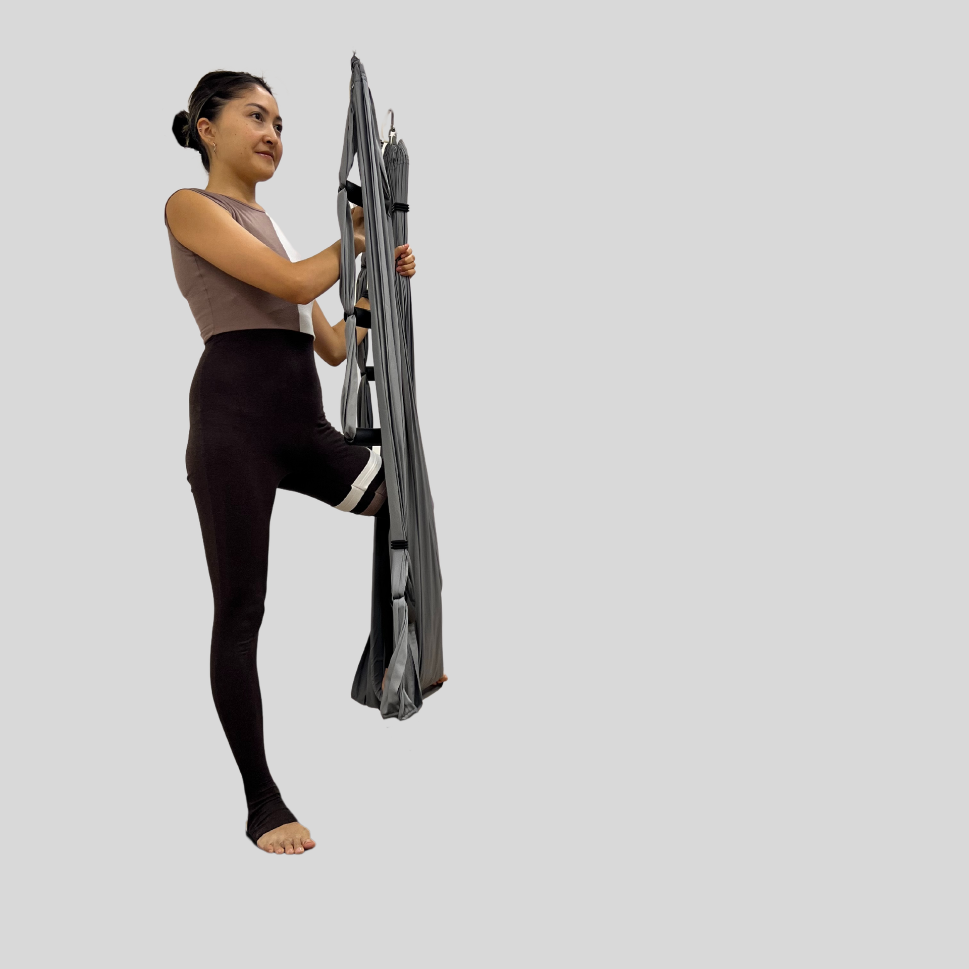 Исходное положение: стоя лицом к гамаку, полотно собрано в узкую ленту. Правую стопу разверните примерно под углом 45 градусов пяткой внутрь, максимально выпрямите правую ногу. Выпад вперед на левую ногу так, чтобы бедро оказалось параллельно полу, а голень перпендикулярно. Следите за тем, чтобы угол в левом колене был не менее 90 градусов. Руками создаем натяжение гамака. Взгляд направьте вперед. Позвоночник вытягивайте от копчика до макушки.