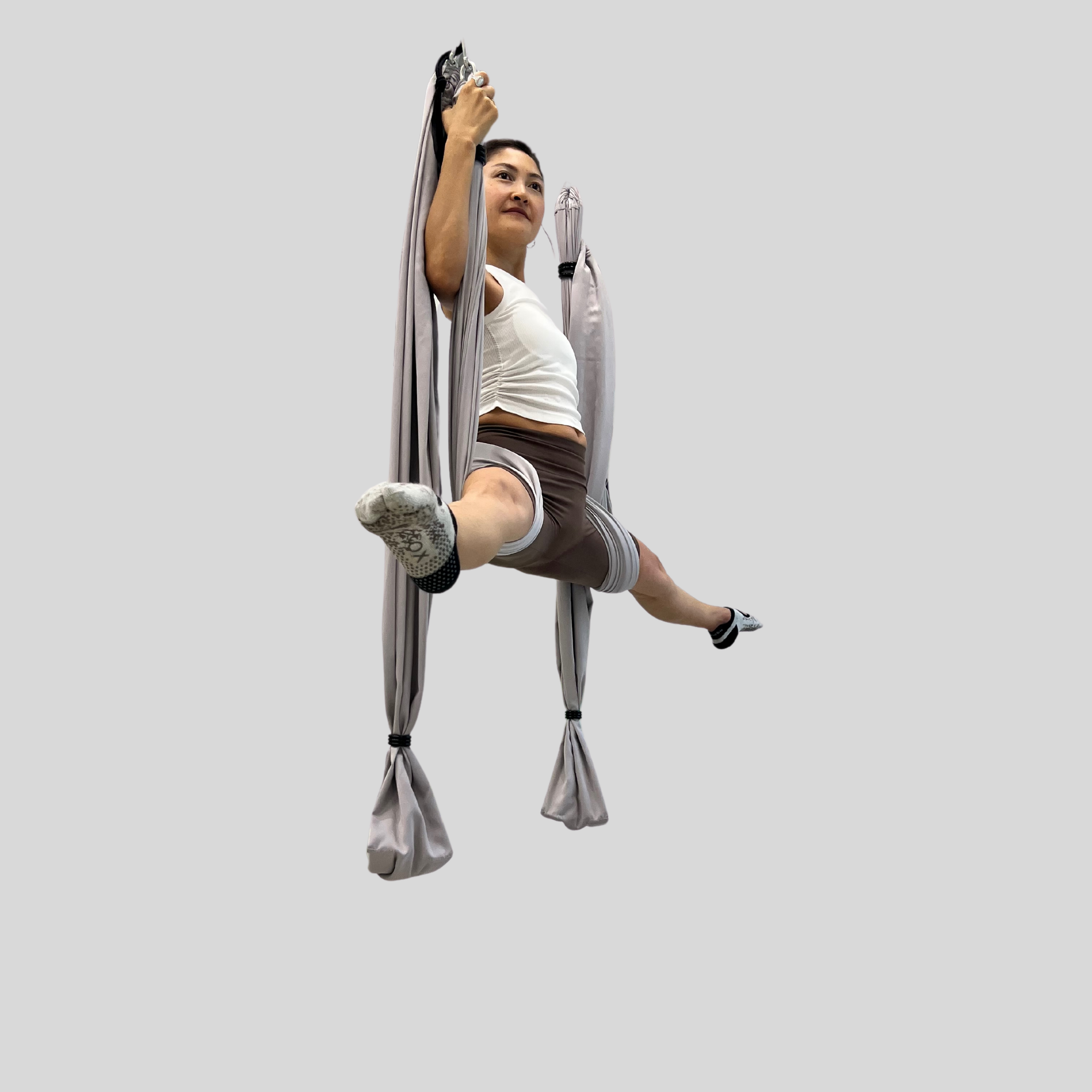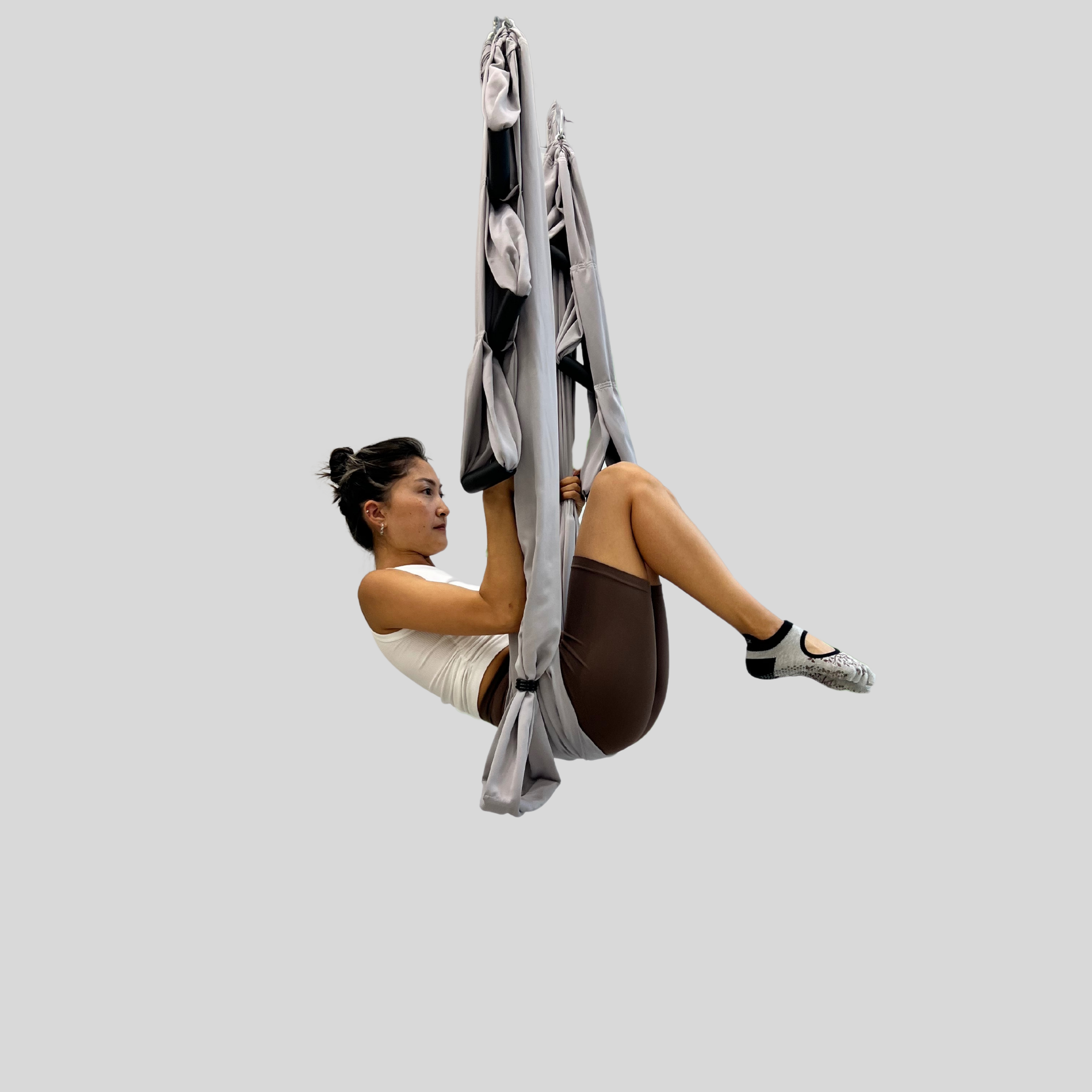 Исходное положение: стоя, гамак собран в узкую ленту. Гамак прижимайте к крестцу фиксируя руками. Перенесите вес на гамак приподнимите ноги и захватите стенки гамака с внешней стороны. Опустите корпус, руки на пол. Чтоб выйти дотянитесь до стенок гамака, подтяните себя руками опустите ноги. Также можно выйти через кувырок. После сделайте компенсацию