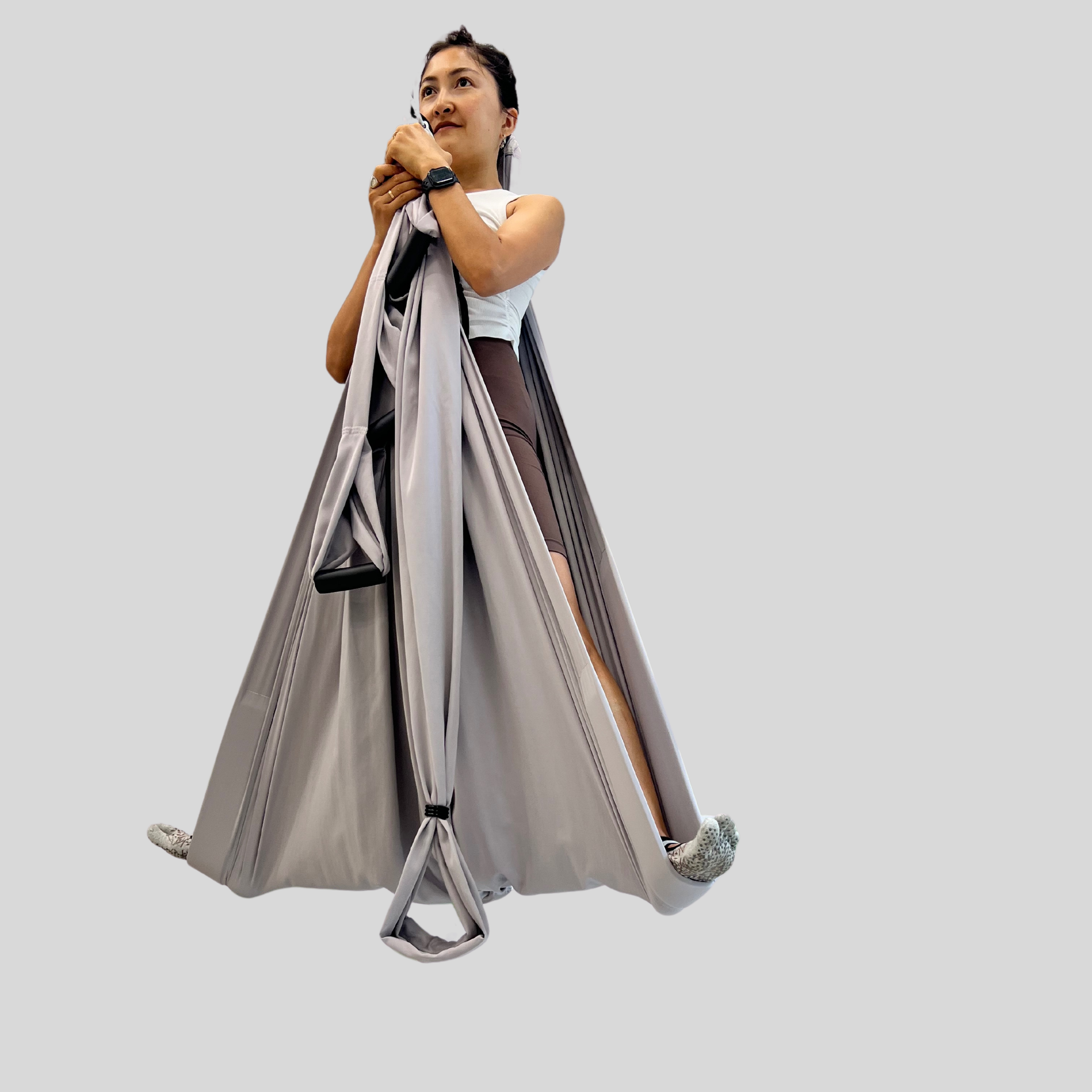 Исходное положение: стоя, левым боком к гамаку. Гамак собран в узкую ленту, расположен под бедром. Левой рукой держим стенку гамака/ ручку, правая рука на поясе или вытянута. Правая стопа плотно прижата к полу. Выполняем выпад и останавливаемся, когда бедро будет параллельно полу. Взгляд направьте вперёд или перед собой. Распределяем вес между опорной ногой на полу и гамаком. Если появляется сильное натяжение по внутренней поверхности бедра вытянутой ноги, не опускаем таз низко или сокращаем расстояние между бедрами. Макушкой постоянно тянитесь вверх. По желанию можно развести руки в стороны.