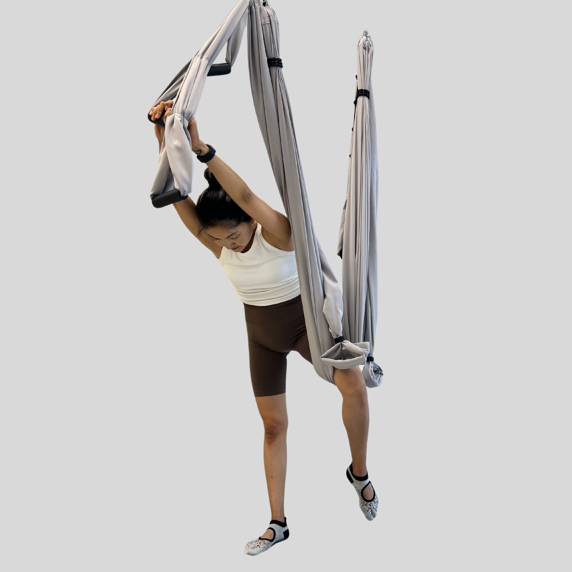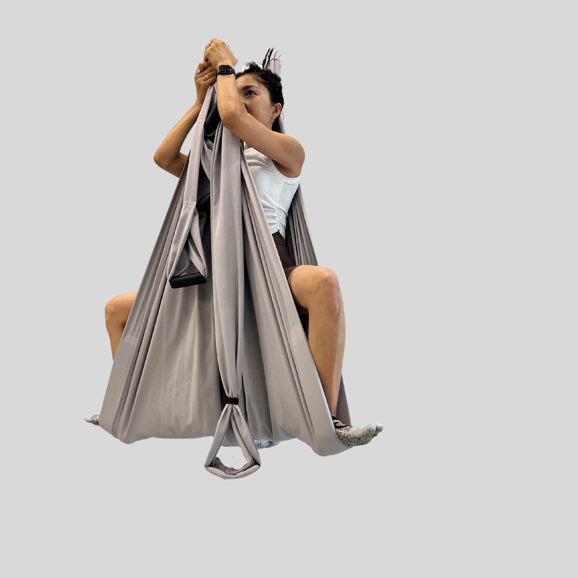 Исходное положение: стоя, левым боком к гамаку. Гамак собран в узкую ленту, расположен под бедром. Левой рукой держим стенку гамака/ ручку, правая рука на поясе или вытянута. Правая стопа плотно прижата к полу. Выполняем выпад и останавливаемся, когда бедро будет параллельно полу. Взгляд направьте вперёд или перед собой. Распределяем вес между опорной ногой на полу и гамаком. Если появляется сильное натяжение по внутренней поверхности бедра вытянутой ноги, не опускаем таз низко или сокращаем расстояние между бедрами. Макушкой постоянно тянитесь вверх. По желанию можно развести руки в стороны.