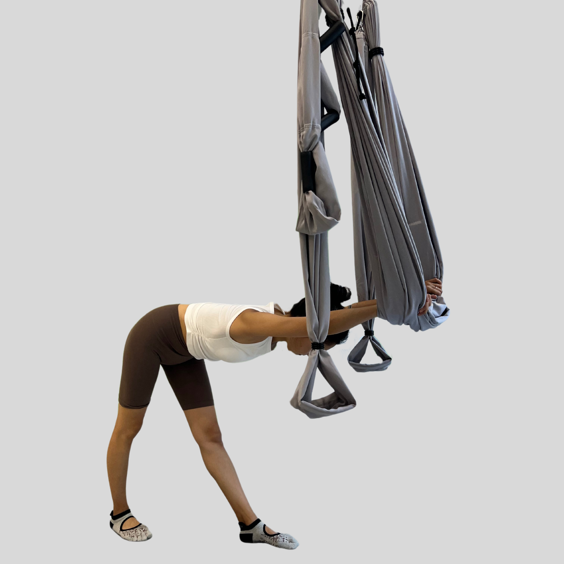 Исходное положение: стоя, нога левая в гамаке руками захватите длинные ручки. Начинаем опускать корпус вниз, одновременно распределяя вес между опорными точками. «Закрываем» таз — проверяем, что пятка поднятой ноги направлена строго вверх, колено вниз, а подвздошная кость параллельна полу.Выравниваем положение корпуса — оба плеча на одном расстоянии от пола.Ладони отталкиваемся от ручек.Продолжаем тянуться за пяткой поднятой ноги назад и за макушкой — вперёд.Смотрим в одну точку на полу и остаёмся в позе на несколько циклов дыхания.